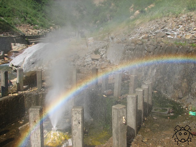 間欠泉の「水(湯?)しぶき」に、太陽が当たると、