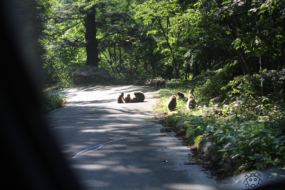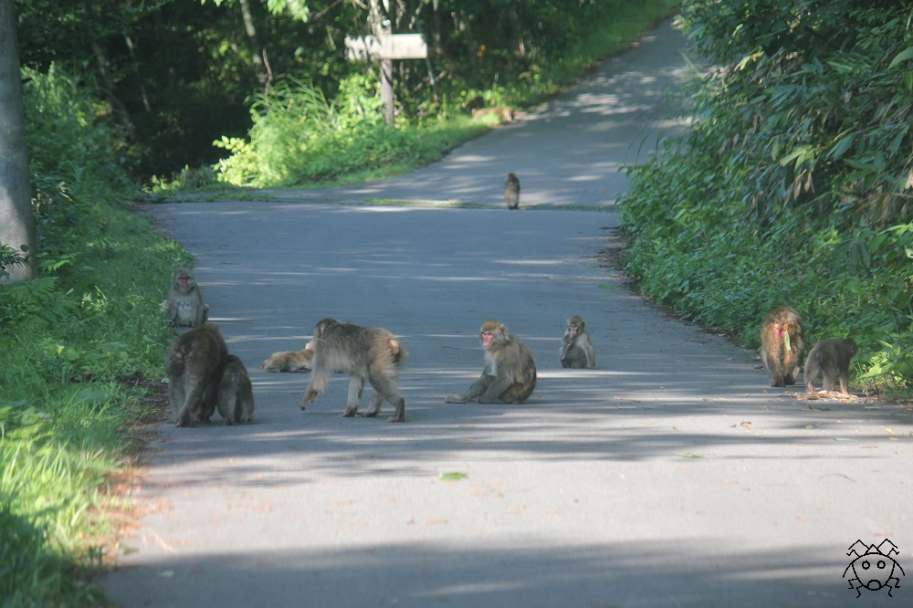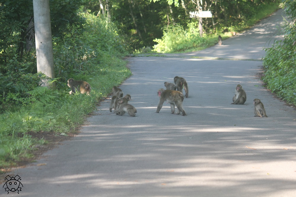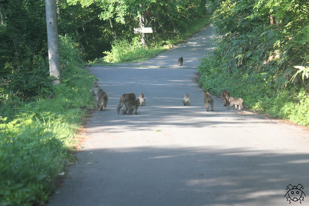 この道路では、ときどきニホンザルの群れに出会う。