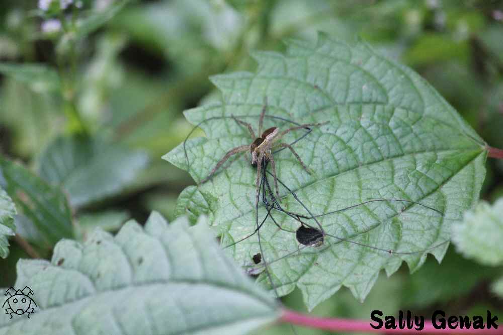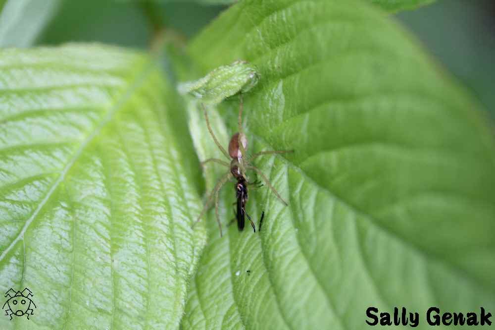 クモは、正確に、ザトウグモの小さな胴体の部分を捕えている。