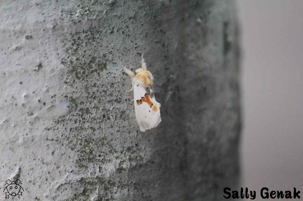 真っ白な翅に鮮やかなオレンジ色と黒の斑紋があり、