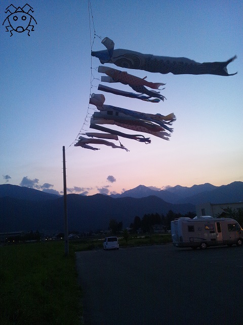 車中泊予定の道の駅で、北アルプス連峰を背景に、