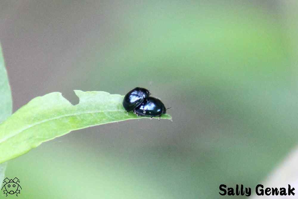 後ろに黒いホシがふたつあるハムシなので、