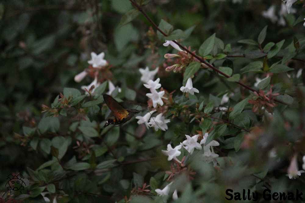 カメラを構えると、突然ホシホウジャクが飛んできた。