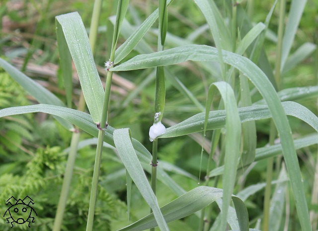 例えば、ヨシの葉っぱにも、こんな感じの泡が見つかる。