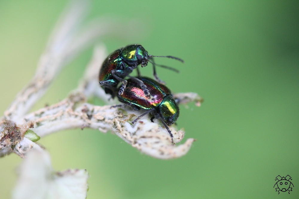 この写真のように、アカガネサルハムシは、まさにメタリックである。