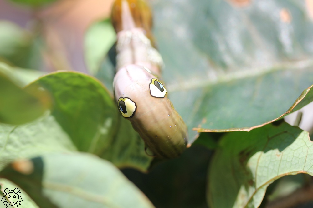 まるで漫画のような目玉模様のアケビコノハ幼虫。