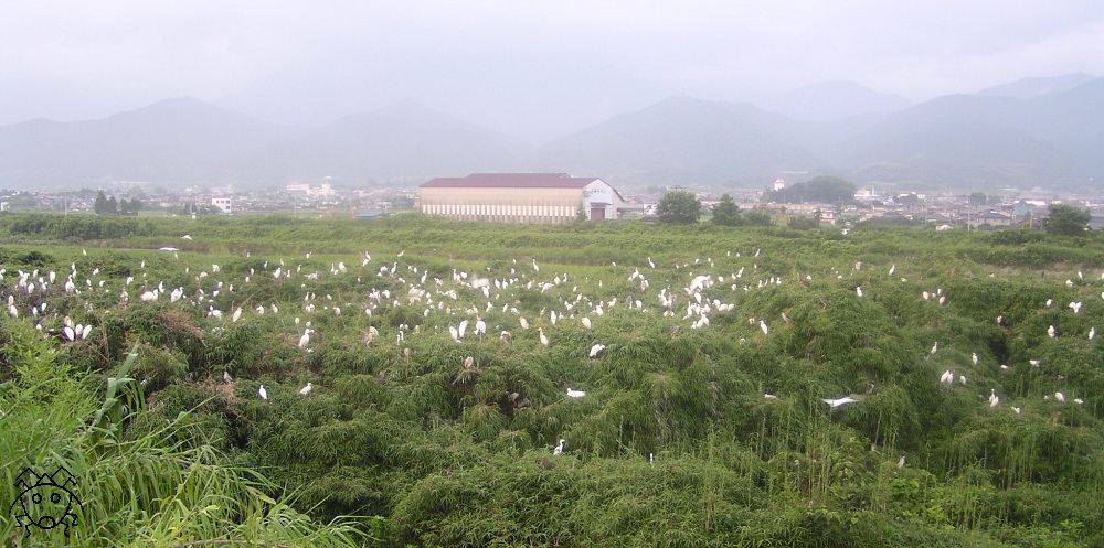 こんな民家が近くにある河原に、膨大な数のサギ軍団。