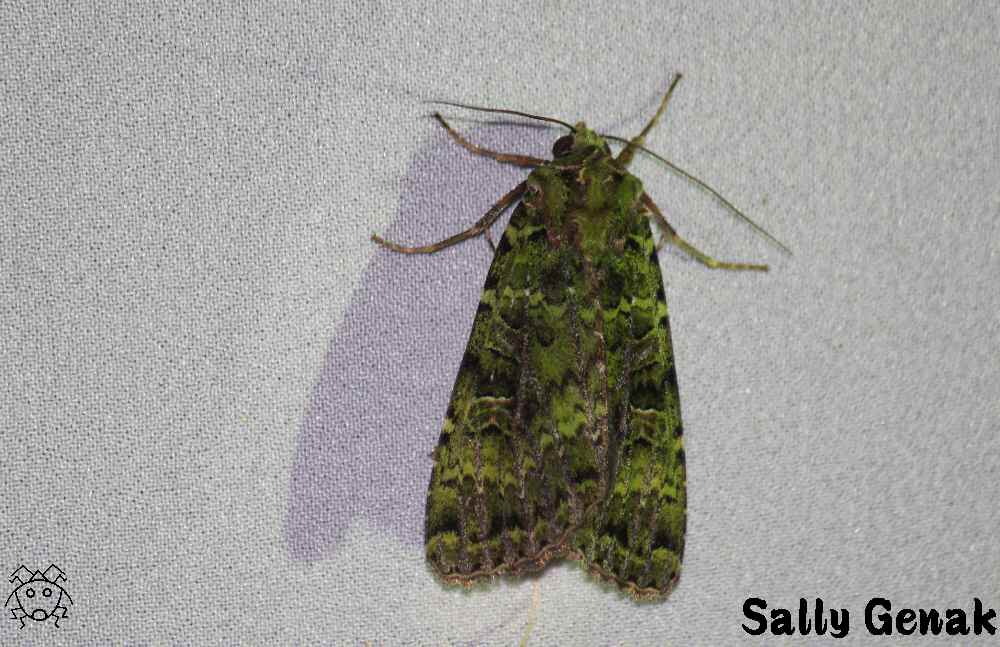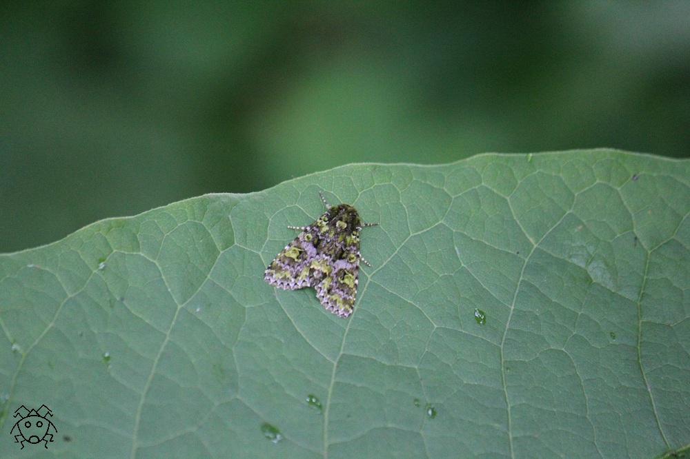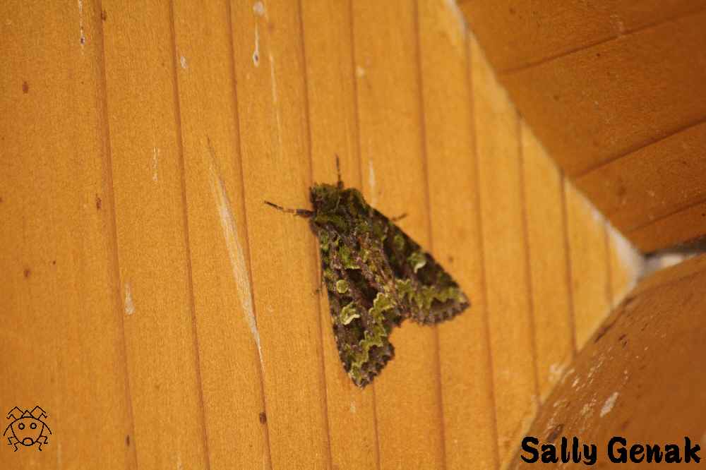 緑色の葉っぱの上に、枯れ葉模様の蛾が翅を開いて止まっていたら、