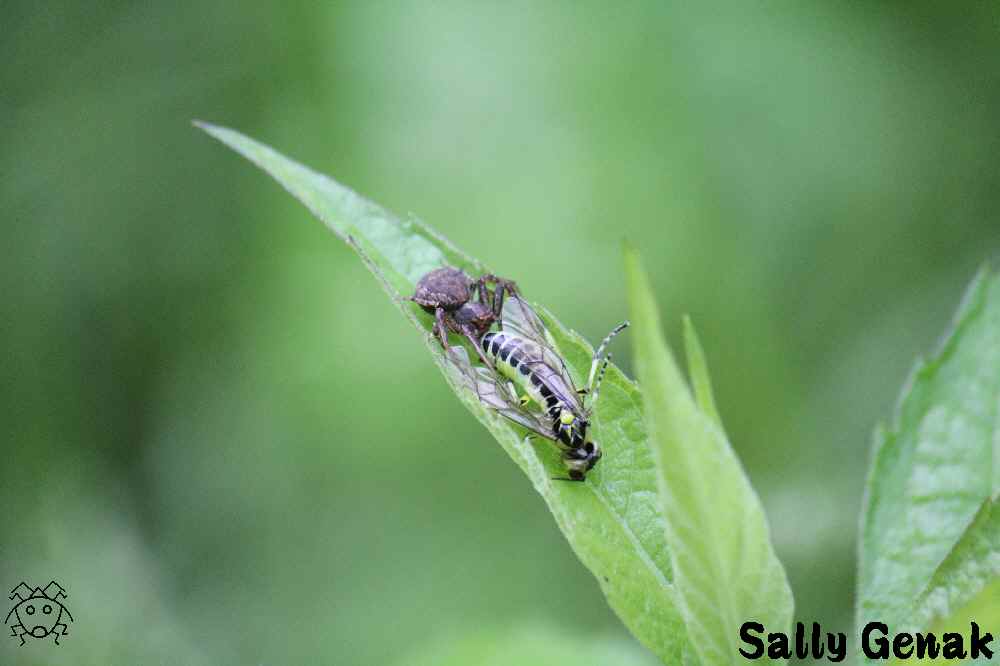 カニグモの一種がハバチの仲間を捕獲