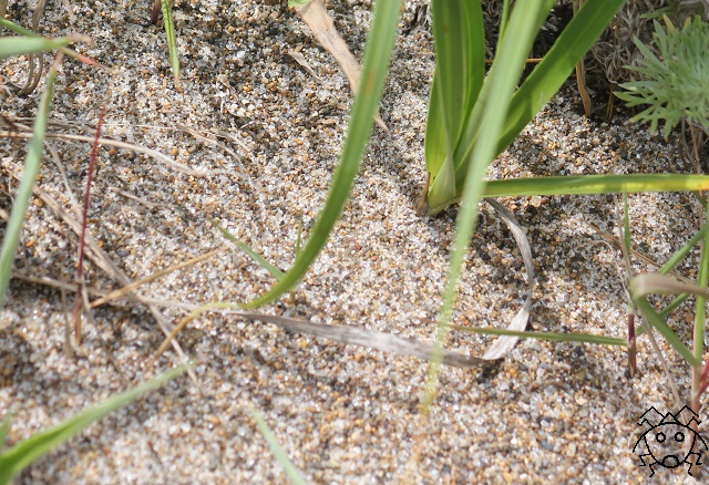 やや左上のあたりに、砂粒に紛れたバッタがいる。