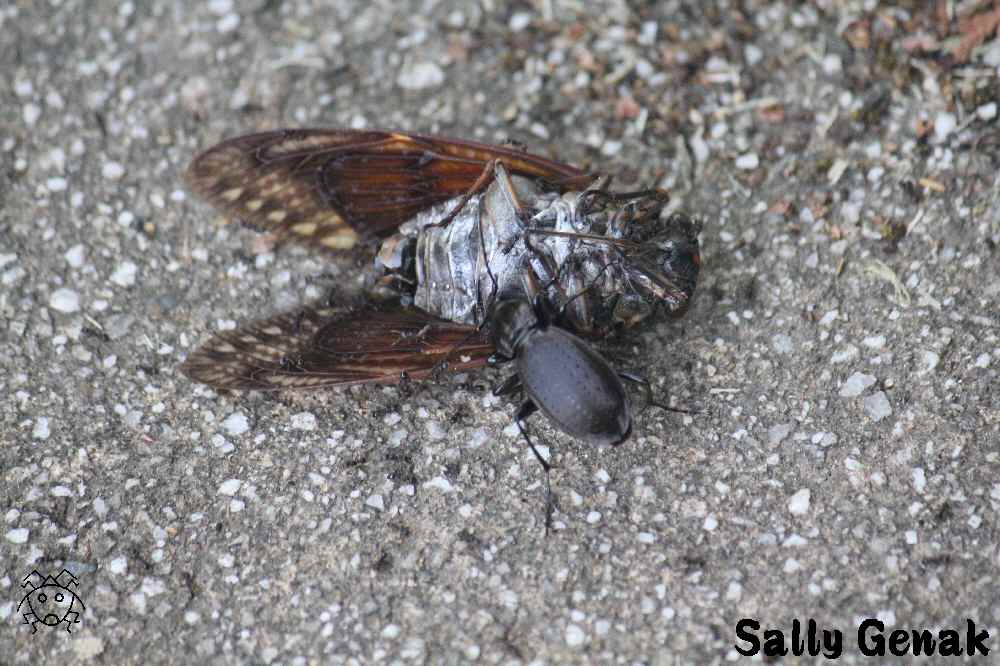 アブラゼミが、さりげなく舗装道路上に横たわる