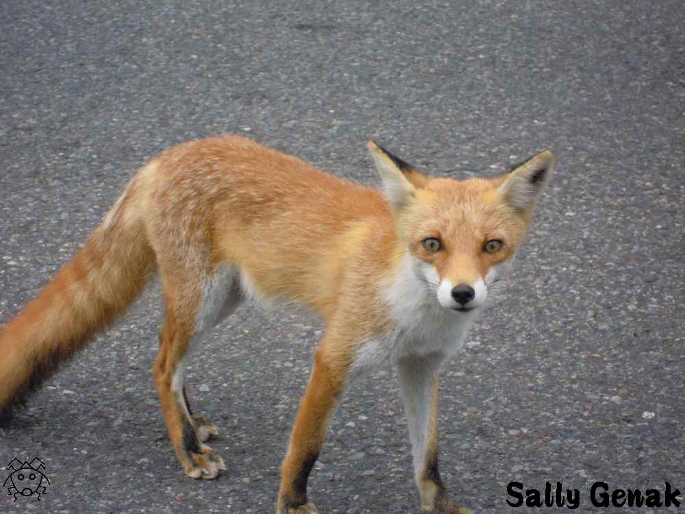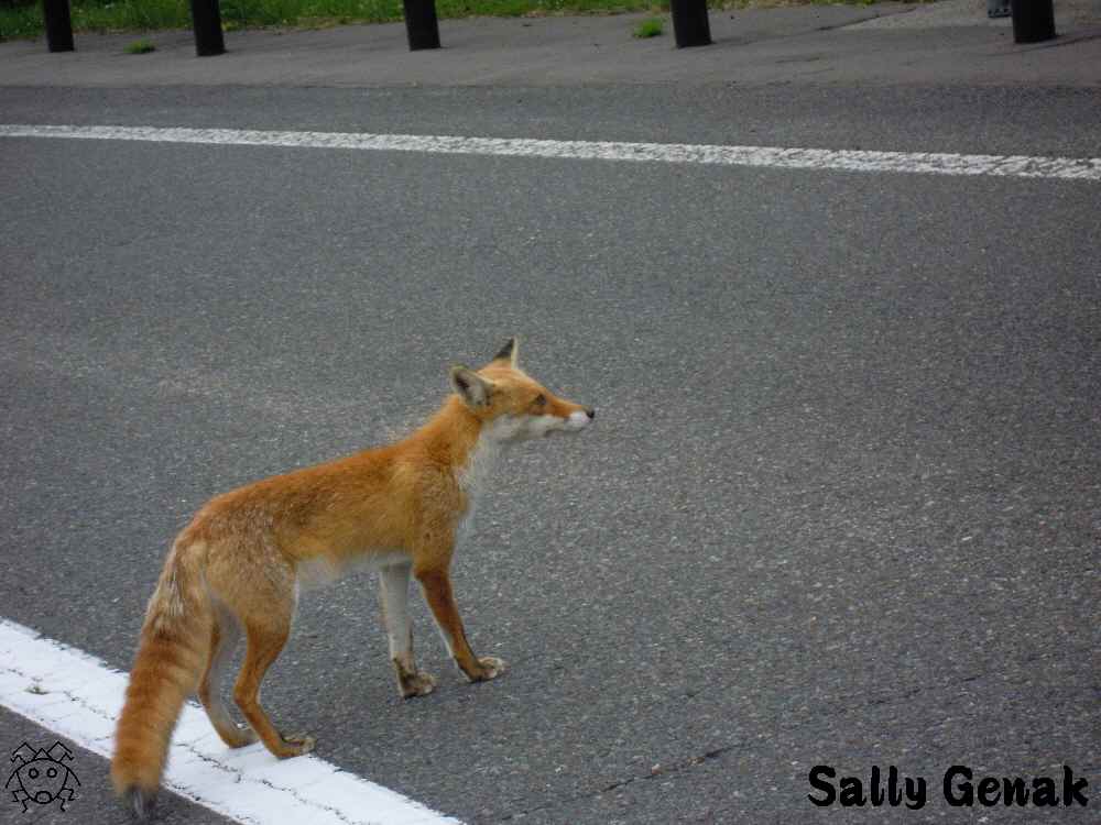 昼間、舗装道路に平気で出てくるキタキツネ。