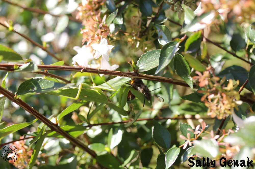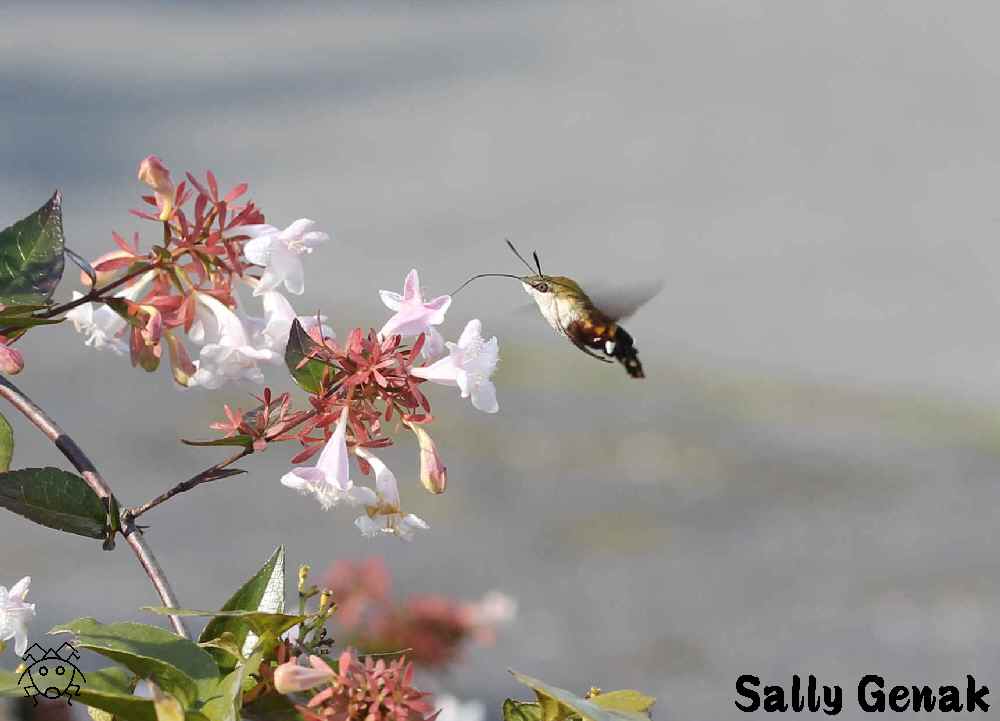 カメラを構えると、突然ホシホウジャクが飛んできた。