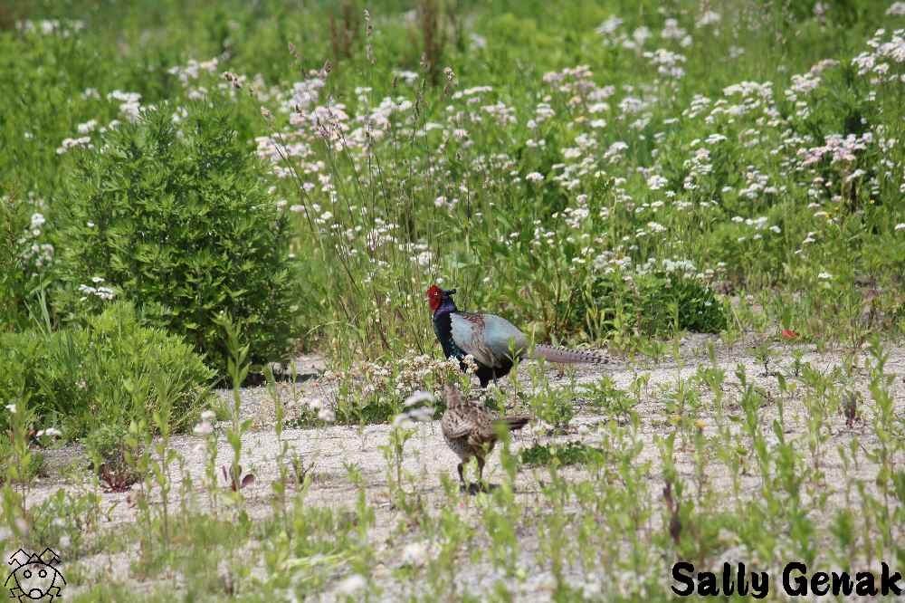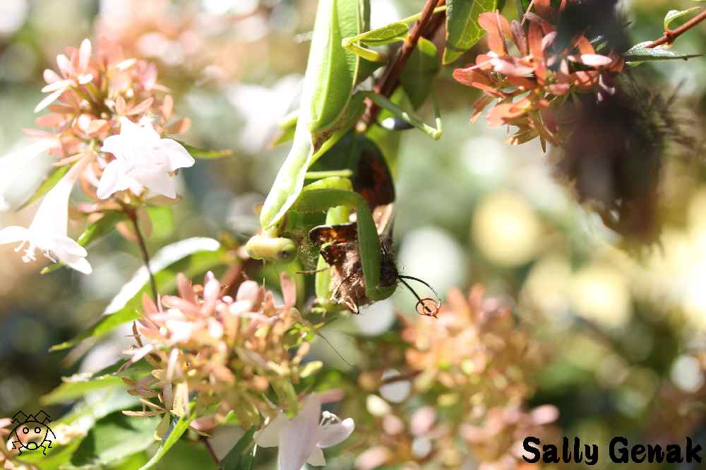 東京・新木場公園で、「カマキリが花にいるな」と、