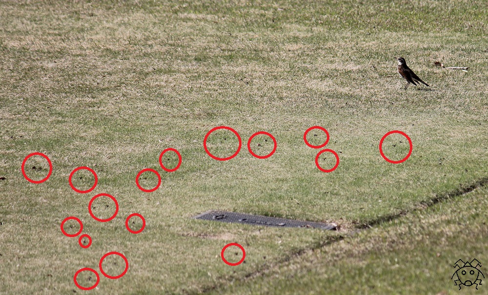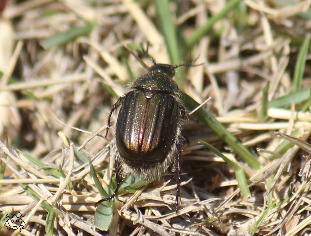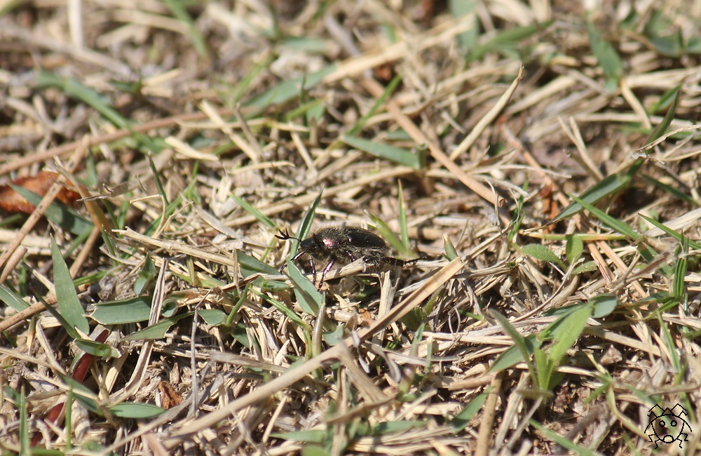 まだまだ茶色の芝生の上を、沢山の小さなコガネムシが、