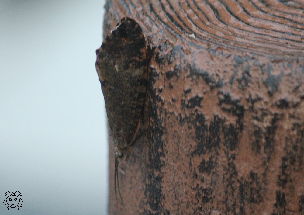 前翅は、茶褐色と黒色のまだら模様だが、