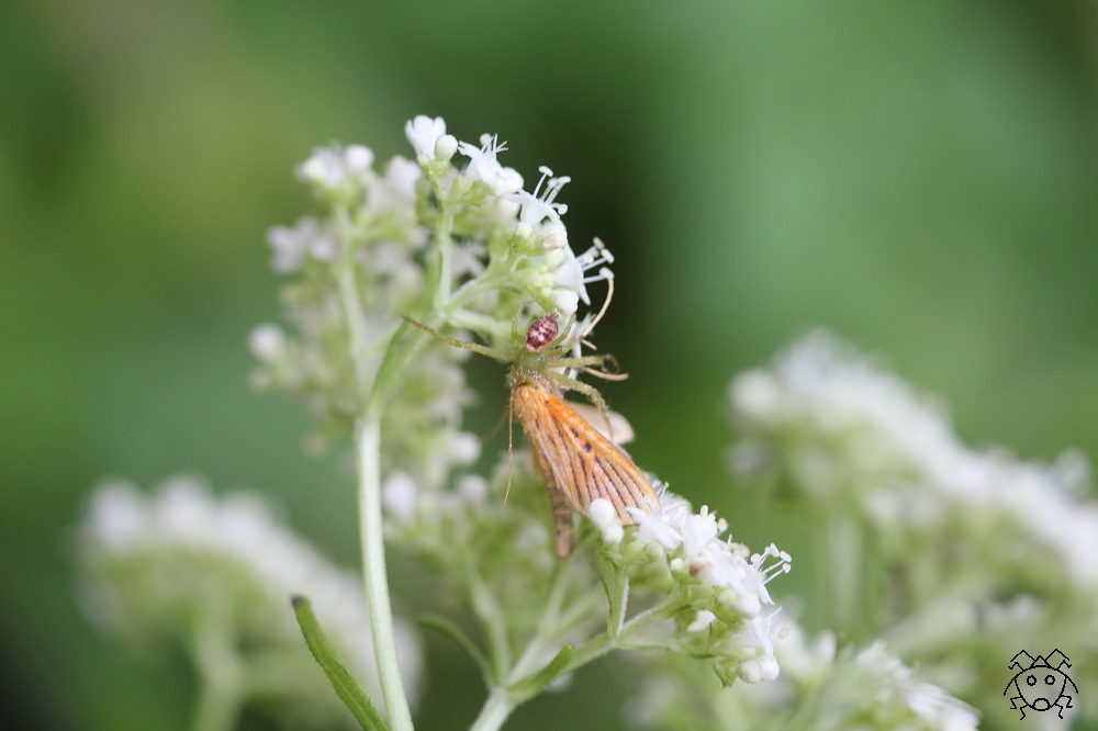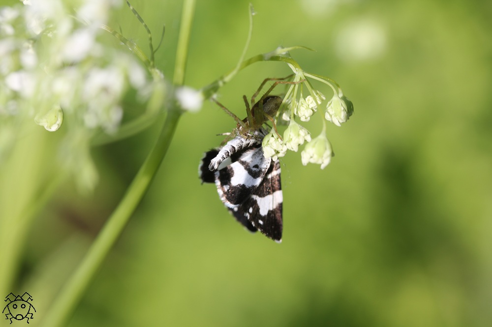 コハナグモがクロスジノマイガを捕獲